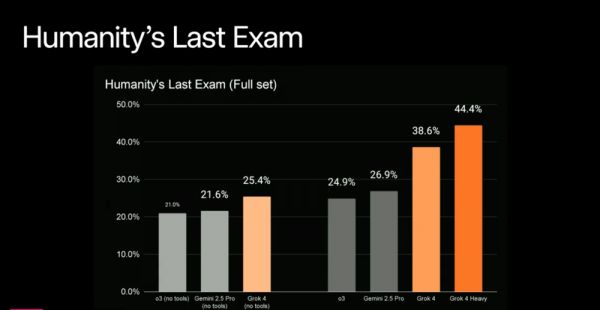 而在使用工具的情况下,Grok 4 Heavy的得分达到44.4%,远高于使用工具后Gemini 2.5 Pro的26.9%。