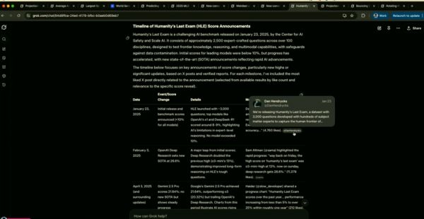 比如,根据X平台上的公开发帖,它能梳理出多个AI模型的基准测试成绩、厂商更新节奏以及社区反应。用户可以一目了然地看到OpenAI的分数表现、Gemini的更新迭代等。