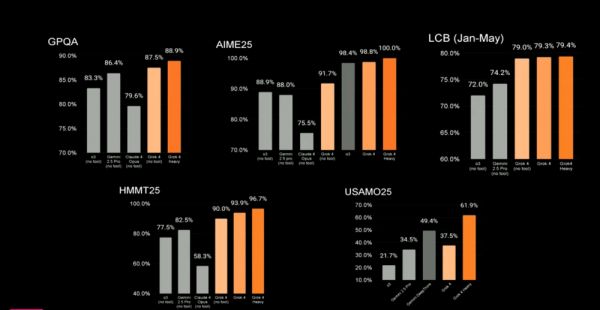 不仅如此,在多项编程相关测试中,Grok 4 Heavy的表现同样抢眼。无论是Live Coding、HMMT(麻省理工数学竞赛)还是USAMO(美国数学奥林匹克),它都远超当前排名第二的模型,技术优势相当明显。