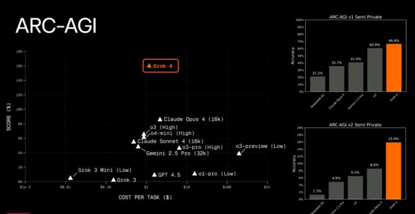 非营利组织Arc Prize则指出,Grok在其ARC-AGI-2测试中创下新纪录。这是一项视觉推理类基准测试,AI需识别图像中的模式。Grok的得分为16.2%,几乎是当前排名第二的Claude Opus 4的两倍。