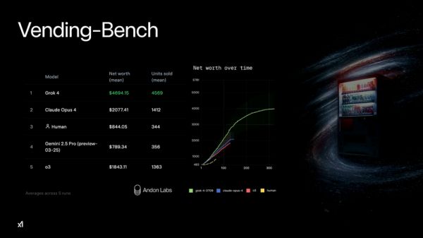 测试结果显示,Grok 4不仅登顶排行榜,而且它所获得的净资产是其他模型的两倍。连马斯克都开始调侃说:「以后买显卡的钱,可以让Grok去部署运营一百万个自动售卖机赚回来」。