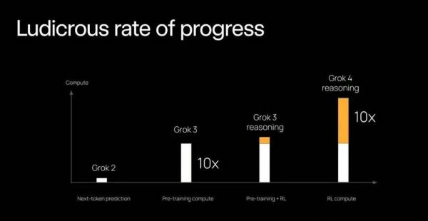 与Grok 2相比,Grok 4训练量增加了100倍,并且还在持续扩张。特别是在推理和强化学习(RL)方面,Grok 4投入了大量计算资源,其RL计算量是其他任何模型的10倍以上。