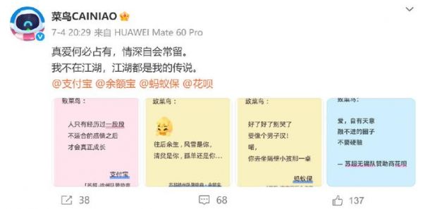 随后,菜鸟官方以“真爱何必占有,情深自会常留”作出回应。