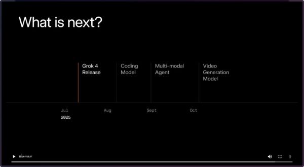 这还不是 Grok 4 全部潜力。按照马斯克的说法,Grok 4 基础模型的第七版将在本月完成,然后将进行后训练 RL(强化学习)等,最终也会拥有出色的视频理解能力和工具调用能力。按照路线图,接下来几个月 xAI 还会推出代码模型、多模型智能体以及视频生成模型。