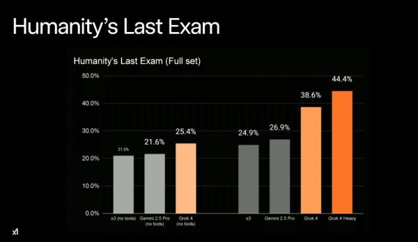 但比起这些已经有点乏味的传统基准测试,更有意思的是,Grok 4 还跑了被称为「人类最后一场闭卷考试」的 Humanity’s Last Exam(简称 HLE 测试),并超越此前一众模型,实现了最高 44.4% 的准确率。