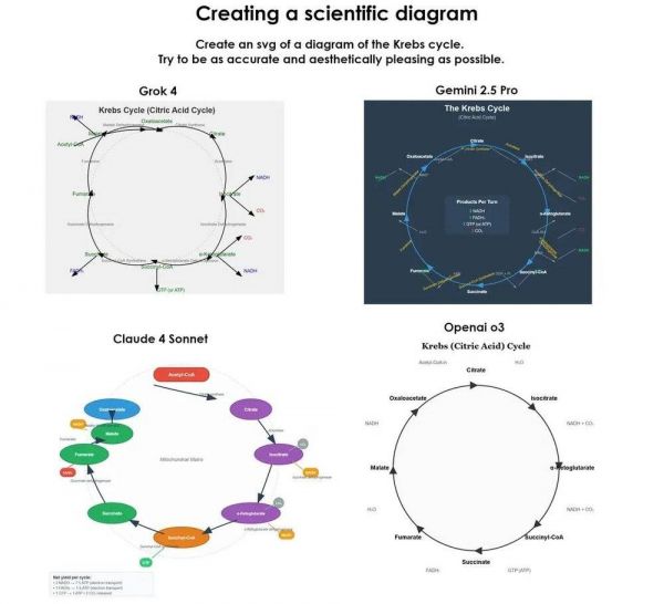 在生物图解任务中,Grok 4的输出有板有眼,NADH、ATP、CO₂等关键要素一应俱全,逻辑严密;Claude 4 Sonnet视觉层次极强,图解效果堪比PPT模板;o3的风格则更像课堂板书,信息量简洁但教学清晰。