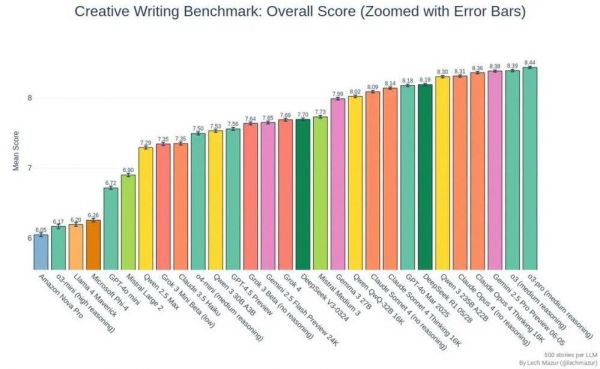 不过,要是拉到更宏观的短篇小说创意写作基准上来看,Grok 4拿到的7.69分只能算中等水平。