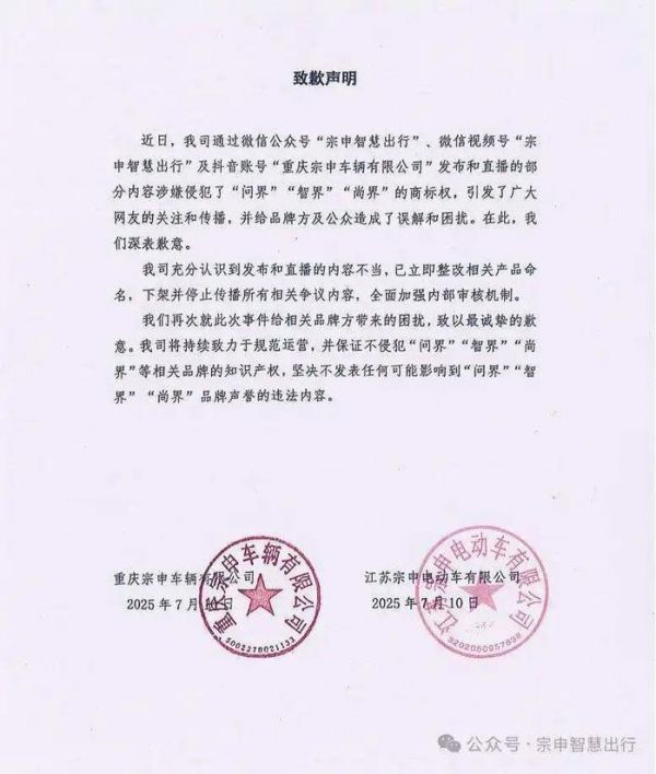 面对汹涌舆论,宗申智慧发布致歉声明,承认其在微信公众号、视频号及抖音账号发布的内容涉嫌侵犯“问界”“智界”“尚界”商标权,已第一时间下架相关产品并停止传播。