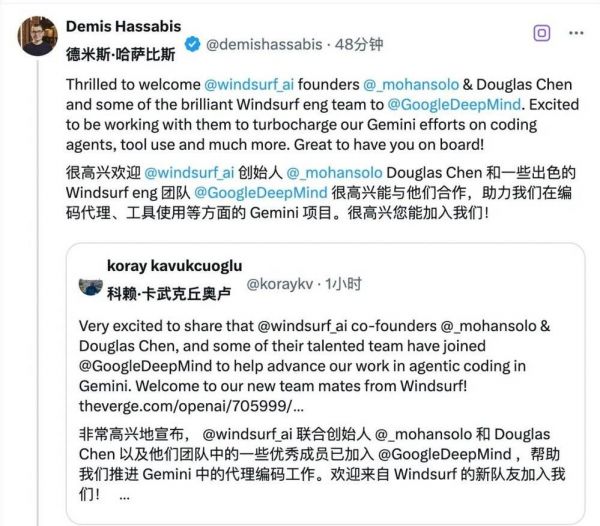 就在刚刚,Google宣布将Windsurf部分高管及工程团队纳入其旗下的DeepMind团队,重点推进“代理式编码”(Agentic Coding)方向的研究。