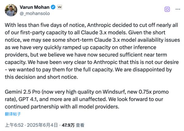 为此,Windsurf紧急上线应急方案,包括限制免费用户访问、启用自带API密钥接入路径,并以优惠价格推广Gemini 2.5 Pro模型以缓解容量压力。