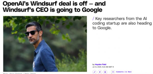然而,就在当地时间7月11日,谷歌和Windsurf居然一起宣布惊人消息,那就是OpenAI 收购Windsurf的交易已取消,谷歌将聘请 Windsurf首席执行官 Varun Mohan、联合创始人 Douglas Chen以及Windsurf 的部分研发员工,并将他们纳入谷歌DeepMind 团队。