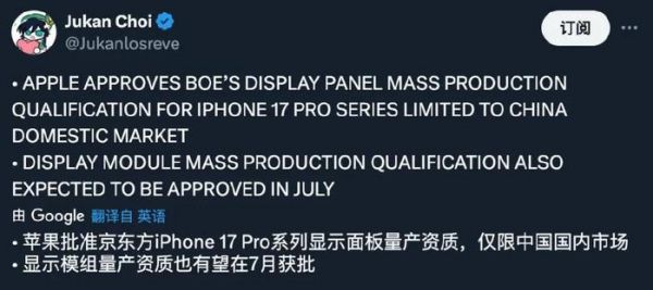据悉,苹果已正式批准京东方的显示面板量产资质,将其纳入iPhone 17 Pro和iPhone 17 Pro Max的屏幕供应商名单,但其装配后的iPhone 17 Pro系列机型将仅面向咱国内市场。