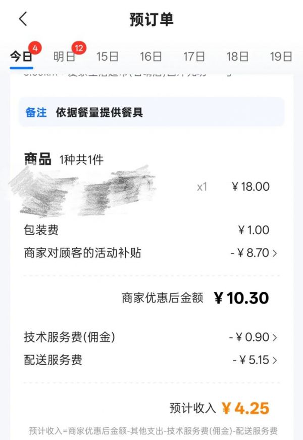 广东个体餐饮商家Will(化名)向时代财经出示的订单显示,7月13日,其门店一张18元的外卖订单,刨去8.7元的商家对顾客的活动补贴(包括3.7元的商家替顾客出的配送费与5元的外卖红包)、5.15元的平台向商家收取的配送服务费、以及0.90元的平台佣金后,商家实际收入仅4.25元。因此,6月中以来,尽管Will的餐厅订单量环比增加了20至30%,但是销售额涨幅并未跟上。