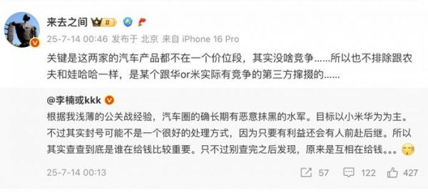这话不仅引发了微博 CEO 王高飞的转发,还对其回应称两家的汽车产品不在一个价位段,其实没啥竞争。随后还补充了一句,说不定是某个跟华or米实际有竞争的第三方撺掇的......