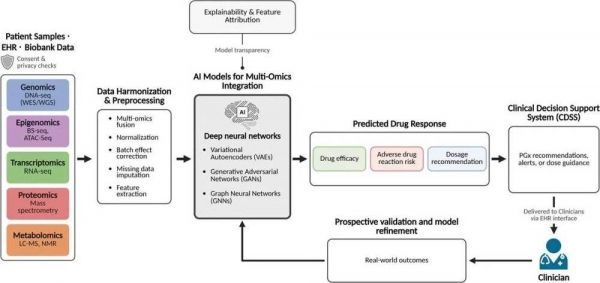 图5预测药物反应的AI驱动多组学流程。源自患者的组学数据,包括基因组学(例如,WES/WGS)、表观基因组学(例如,BS-seq、ATAC-seq)、转录组学(RNA-seq)、蛋白质组学(质谱分析)和代谢组学(例如,LC-MS、NMR),被融合与协调以作为模型输入。深度学习模型(例如,VAEs、GANs、GNNs)预测药物疗效、不良药物反应(ADR)风险和剂量建议。可解释性模块增强模型透明度,而基于真实世界结果的验证则实现持续优化。最终输出通过集成到电子健康记录(EHR)的临床决策支持系统(CDSS)交付给临床医生。来自[9]