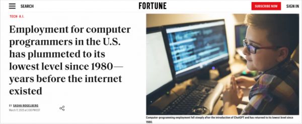 近日美国劳工统计局的《当前人口调查》数据称,美国计算机程序员的就业率已经降至 1980 年以来的最低水平。1980 年,美国计算机编程工作岗位超过 30 万个。在 21 世纪初的互联网泡沫时期,这一数字曾达到 70 多万,但如今就业机会已萎缩至当时的一半左右。可以说,程序员们夜以继日为之奋斗的大模型,却先革了自己的命。