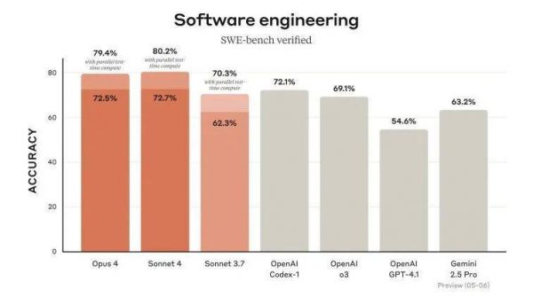 最新的Claude Opus 4,在全球编程模型领域持续领先,在复杂、长时间运行的任务和代理工作流中拥有不错的性能表现,未来也有望能够承担更大的项目任务。最近Claude Code走红,许多程序员称赞它是目前最好的编程工具。