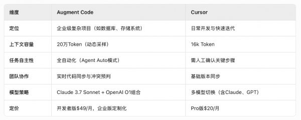 最近火热的Augment Code,目标是“成为最懂你整个代码库的AI编程伙伴”。augment支持高达200K Tokens(20万)的上下文窗口,这样的好处是前后端、数据库模型、各种配置文件等都可以放到大模型中,让编程助手更理解用户的项目架构。它还可以索引多个关联的代码库,实现跨项目理解和代码生成,对于复杂业务逻辑更多的大项目来说,更为友好。而且,相比Cursor传统上“一问一答”的交互方式,Augment的自动化程度更高,省去了不少问答模式下反复追问的麻烦。