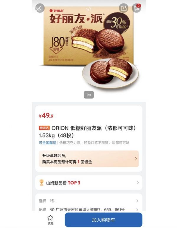 社交媒体上被质疑的这款商品全名为“低糖好丽友派”,于今年6月在山姆上新。新品在原有配方上进行了创新,减少了80%的糖分,同时增加了30%的可可含量,售价为49.9元一盒,内含48枚。