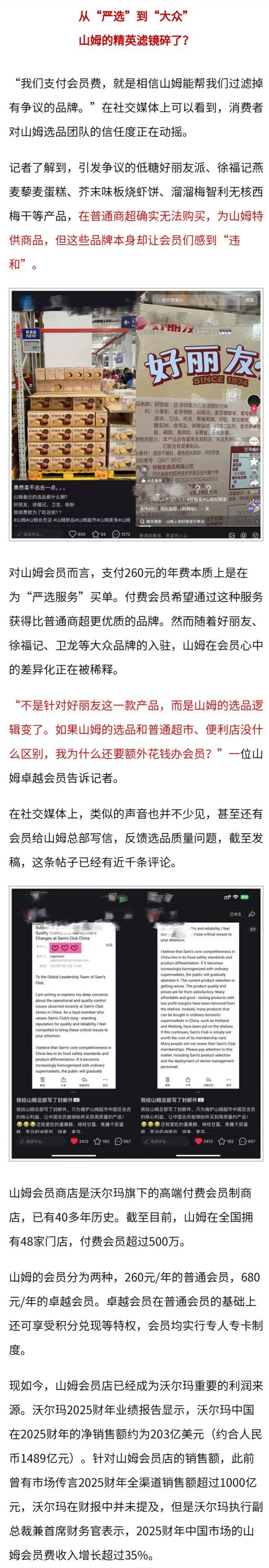 近日,山姆会员商店因上架好丽友派引发会员强烈不满。这场争议源于山姆近期密集的商品调整。一方面,好丽友、卫龙、徐福记等大众品牌新品陆续入驻;另一方面,蛋黄酥、杨枝甘露、焦糖饼干千层等曾引发抢购的热门商品却悄然下架。选品策略的变化,叠加此前频发的品控问题,让不少会员直呼“山姆与普通超市相比越来越同质化”。
