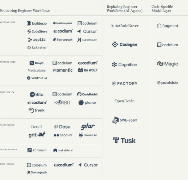 目前大多数AI编程公司提供的能力主要有3大类,第一类是程序员助手,从IDE环境插件切入,更多是一个Copilot的角色,增强现有的工作流、提升效率;第二类是主打Agent,希望成为一个能够端到端执行任务的“数字程序员”。第三类是专注在特定代码模型,从领域入手,构建差异化的竞争力。