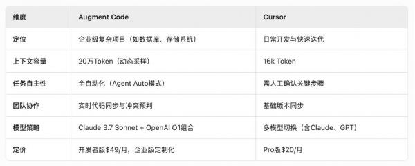 最近火热的Augment Code,目标是“成为最懂你整个代码库的AI编程伙伴”。augment支持高达200K Tokens(2 0 万)的上下文窗口,这样的好处是前后端、数据库模型、各种配置文件等都可以放到大模型中,让编程助手更理解用户的项目架构。它还可以索引多个关联的代码库,实现跨项目理解和代码生成,对于复杂业务逻辑更多的大项目来说,更为友好。而且,相比Cursor传统上"一问一答"的交互方式,Augment的自动化程度更高,省去了不少问答模式下反复追问的麻烦。