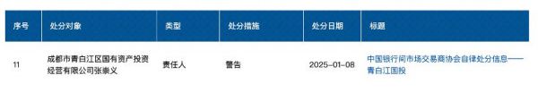 除去本次提及的5个对象外,还有咸阳金融控股集团有限公司、咸阳市财政投资控股有限责任公司、中国中金财富证券有限公司、河北临西农村商业银行股份有限公司、成都市青白江区国有资产投资经营有限公司、成都市青白江区国有资产投资经营有限公司张崇义等被协会予以处分。