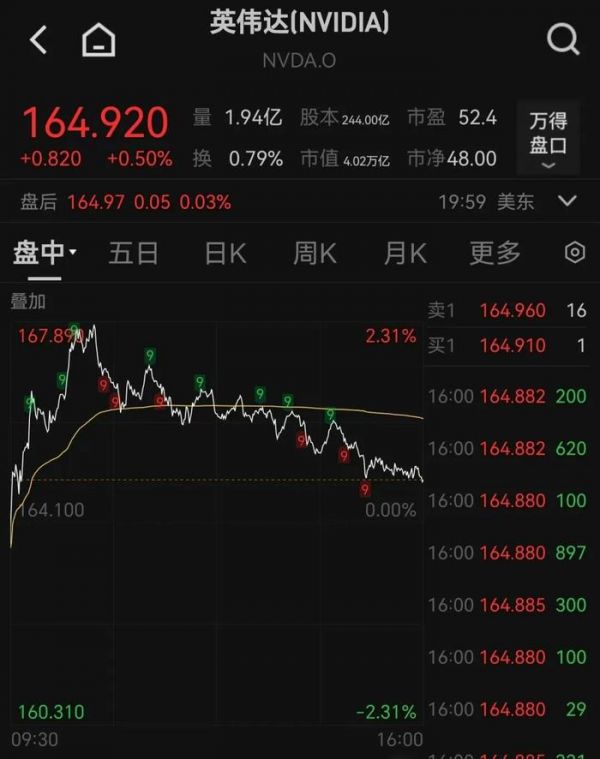 截至7月11日美股收盘,英伟达股价当天上涨0.5%,至每股164.92美元,市值达到4.02万亿美元。