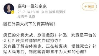 昨日,北京嘉和一品企业管理有限公司总经理刘京京在社交媒体上发出“困在外卖大战下的真实呐喊”。