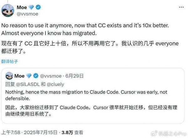 本月初,据 The Information 报道,Anthropic Claude Code 的两位负责人 Boris Cherny 和 Cat Wu 被 AI 编程应用 Cursor 的开发商 Anysphere 挖走。详见机器之心报道:《从亲密伙伴抢人,Cursor挖走Claude Code两位核心人物》