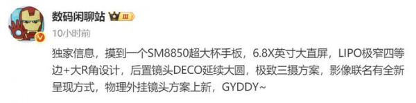 近期一款代号SM8850的设备得到了曝光,这是小米计划在2025年底推出的影像旗舰,也就是小米16 Ultra。