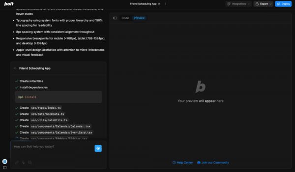 Bolt.new的核心功能简单到极致:用户只需在对话框里用自然语言描述需求,它就能在约1分钟内生成、运行并部署一个包含前端、后端和数据库的完整应用程序。一位东海岸的销售人员用它为患病的女儿制作了旅行医疗资源网站;Eric Simons 71岁的母亲用它建立了个人护士生涯网站。