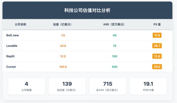 我们做了个表格,展示了下Bolt、lovable、Replit、cursor目前大概的估值和年收入情况,这能够从某个程度反映这家公司的投资想象。Lovable是Bolt.new最强有力的竞争对手,从其PS值就可以看出,Lovable的PS值达到了26.7倍。