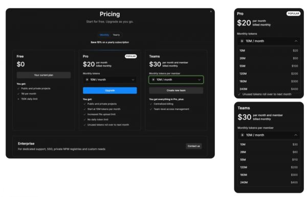 用户爆发增长后,Bolt进行了调整。当他们推出Bolt后,用户需求井喷,很多人很快就把免费额度用完了,希望能买更多使用量,9美元套餐根本满足不了高强度的实际使用需求。所以他们基于token(也就是生成和处理内容的计算额度)数量,推出了不同价位的按月付费/按年付费选择(年付便宜10%),分为团队版和个人版。