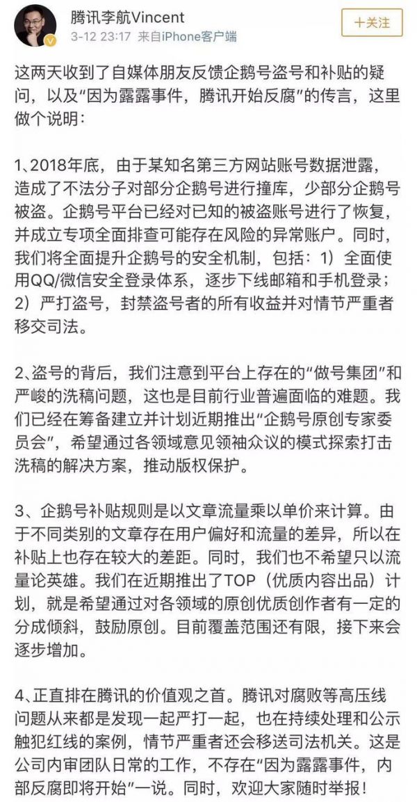 新京报讯 3月12日晚间11时,针对《河南女孩露露给我上了一堂七万的课》中提到的企鹅号在无提示情况下被盗,盗号后产生的巨大收益,以及盗号产业背后可能的利益链,腾讯集团市场公关部总经理李航进行了一一回应,并称不存在“因为露露事件,内部反腐即将开始”一说。