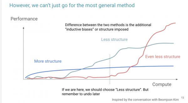 然而,这并不意味着我们应该盲目采用最端到端的方法,因为这种方法根本不可行。相反,我们应该在当前的计算能力、数据、学习目标、架构水平下,找到一个“最优”的结构。换句话说,什么是刚开始显现生命迹象的最端到端结构?这些结构更具可扩展性,最终在规模扩大时会超过那些结构更复杂的模型。