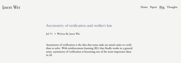 验证的不对称性(Asymmetry of Verification)是指,某些任务验证一个解是否正确,要远比从头解决这个问题容易得多。随着强化学习(RL)最终在通用意义上逐渐成熟,验证的不对称性正成为人工智能(AI)领域中最重要的理念之一。