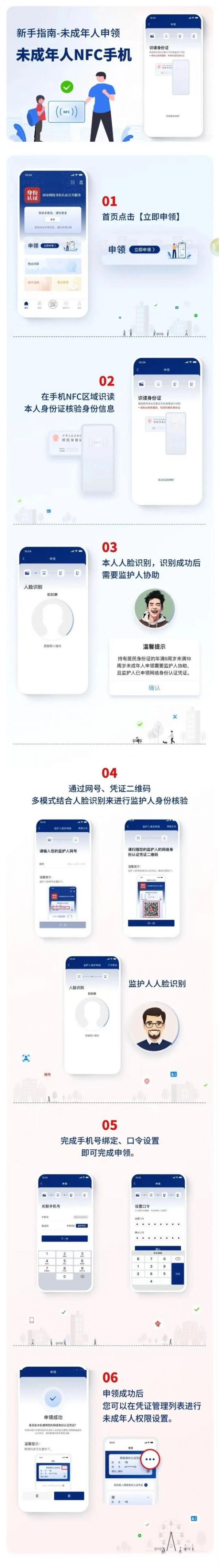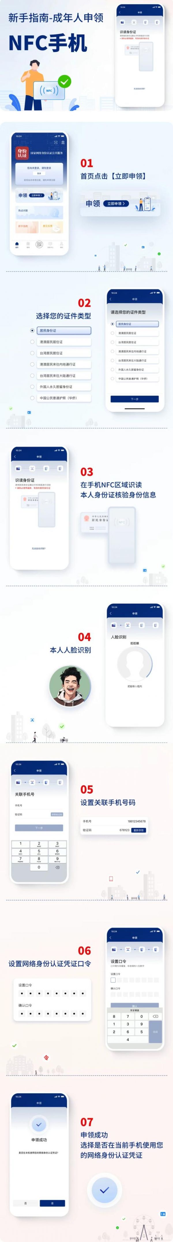 如果是成年人申领的话,首先需要一部支持NFC功能的手机,在应用商店搜索并下载“国家网络身份认证App”。之后,在App首页点击立即申请,选择证件类型,在手机NFC区域识读本人身份证核验身份信息后,进行本人人脸识别,设置关联手机号码和网络身份认证凭证口令,申领成功后,就可以选择在当前手机使用网络身份认证凭证了。