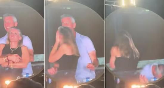 kiss cam(接吻镜头)是体育赛事和音乐会期间,镜头会扫描人群,选出一对情侣,并将他们的影像显示在体育场馆的巨型屏幕上。而酷玩乐队的kiss cam对焦到这对情侣后,两个人不但没有亲吻,而是一脸惊恐、急忙“避嫌”,捂着自己的脸躲闪。