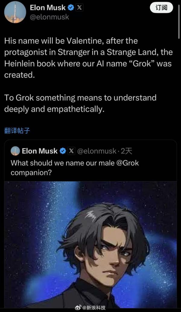 【#马斯克再推AI男友#】18日,马斯克在社交平台X宣布,“明天Grok发布‘AI 男友’Valentine预告视频。”17日,他公布了关于Valentine的信息:该“AI 男友”以海因莱因的小说《异乡异客》中的主人公命名,人工智能名称“Grok”就是在这本小说中诞生的。#马斯克旗下AI男友有名字了#