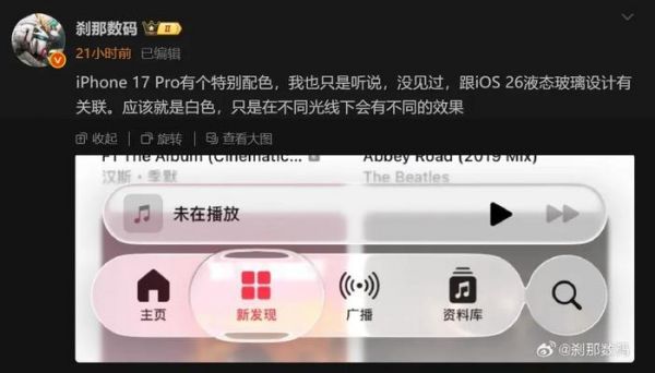 据博主刹那数码的爆料,苹果正在测试一款特别的新配色,预计与iOS 26的“液态玻璃”设计相关。