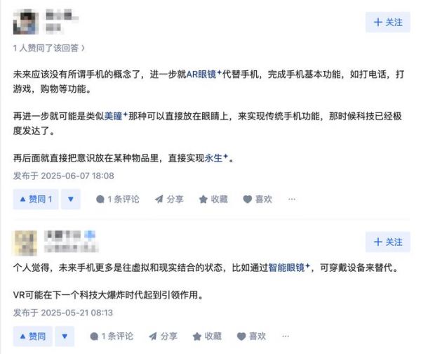 在知乎平台,网友们也曾就手机会有什么新形态展开讨论,但大多数网友认为手机的形态已经发展到了极致,未来取代手机的可能是智能眼镜、植入式设备。