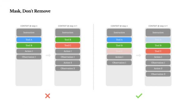 3. 工具管理避免动态增减,用遮蔽代替删除。代理功能多,动作空间会迅速扩大,模型更易选错。动态添加或删除工具会导致缓存失效。Manus的实践是用上下文状态机管理工具可用性:通过屏蔽Token概率,而非直接从上下文移除,既保证灵活性,又保留缓存。