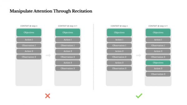 通过不断重写待办事项清单,Manus 将其目标反复写入上下文末尾。这将全局计划推入模型的近期注意力范围,避免了“中途丢失”问题,减少了目标不一致的情况。实际上,它利用自然语言来引导自身关注任务目标——无需特殊的架构改动。
