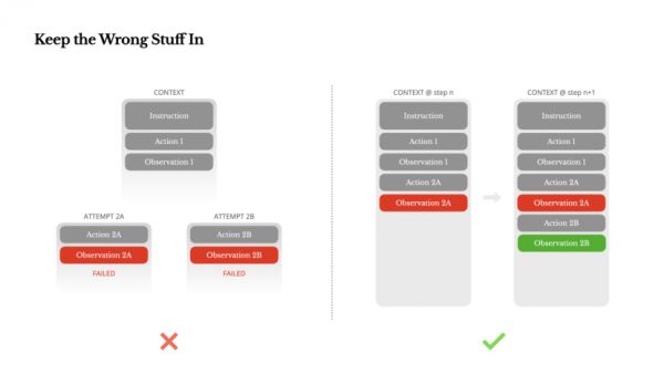 6. 不抹掉错误,保留失败信息以帮助模型自我修正。智能体必然会出错,与其隐藏错误、重新开始,不如把失败信息留在上下文里,让模型“看到”失败路径,形成负面示例,从而减少同类错误。