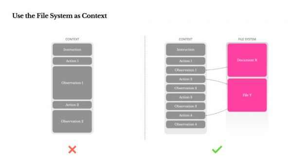 4. 用文件系统承载持久上下文 大模型上下文再长也会被打满。Manus 让模型把长期记忆写入虚拟文件系统,按需读写,实现「外部记忆」,规避信息丢失。