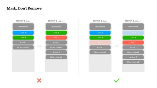 3. 工具不要动态添加,而是用「遮蔽」法控制选择 动态修改工具列表会让缓存失效、模型混乱。Manus 使用「遮蔽 token logits」的方法,让模型「看不见」不应调用的工具。