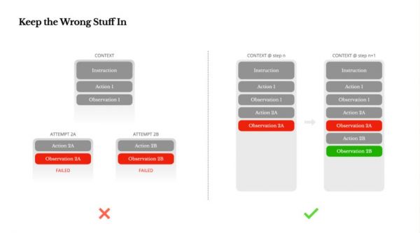6. 错误不是要掩盖,而是要保留 失败是构建 Agent 过程中的一部分。保留错误日志(如失败的操作、堆栈信息),能帮助模型更新内部信念,减少重复错误。