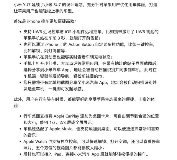 不仅是小米生态,2024年10 月 29 日,在小米 15 系列暨小米澎湃 OS 2 新品发布会上,小米副总裁金凡宣布,小米 HyperConnect 全面支持苹果生态。从小米的另一重磅汽车产品不断优化对苹果的支持来看,小米在多端、跨端读取上已然积累了相应的技术经验。