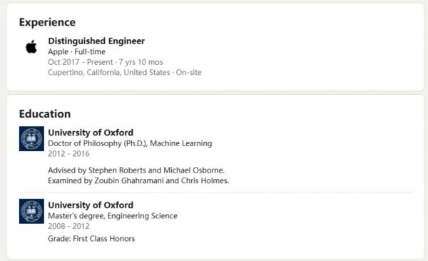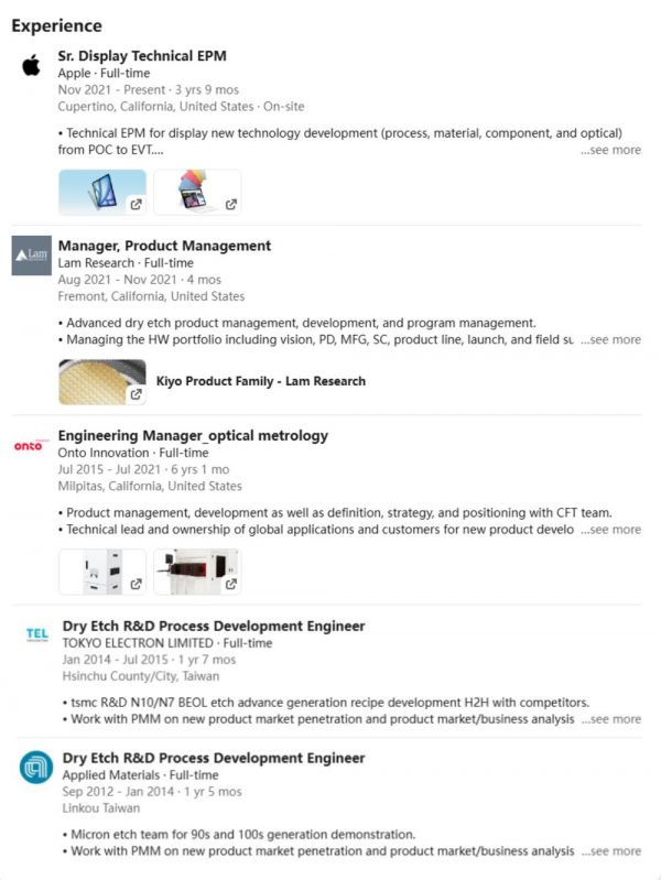 马克·李毕业于台湾科技大学,曾有过干蚀刻研发工艺开发的工作经历,在2021年加入苹果担任高级显示技术EPM。据彭博社报道,他是前苹果基础模型团队的工程师兼经理庞若鸣在苹果招聘的第一位员工。